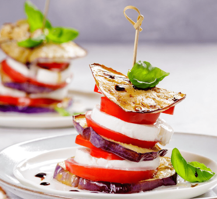 Machen Sie schöne Türmchen: eine Scheibe frittierte Aubergine, eine Scheibe Mozzarella, Tomate, Basilikum, ein paar Ringe Spitzpaprika. Wiederholen Sie dies und enden Sie mit einer Scheibe Aubergine. Beträufeln Sie zwischendurch mit Balsamico und bestreuen Sie alles zum Schluss mit etwas Salz und frisch gemahlenem schwarzem Pfeffer.