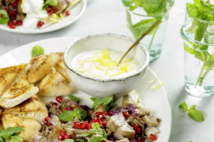 Verdeel het aubergine-gehaktmengsel over de borden en garneer met granaatappelpitjes en verse muntblaadjes. Serveer met de pitanacho’s en de frisse yoghurtdip met citroen.